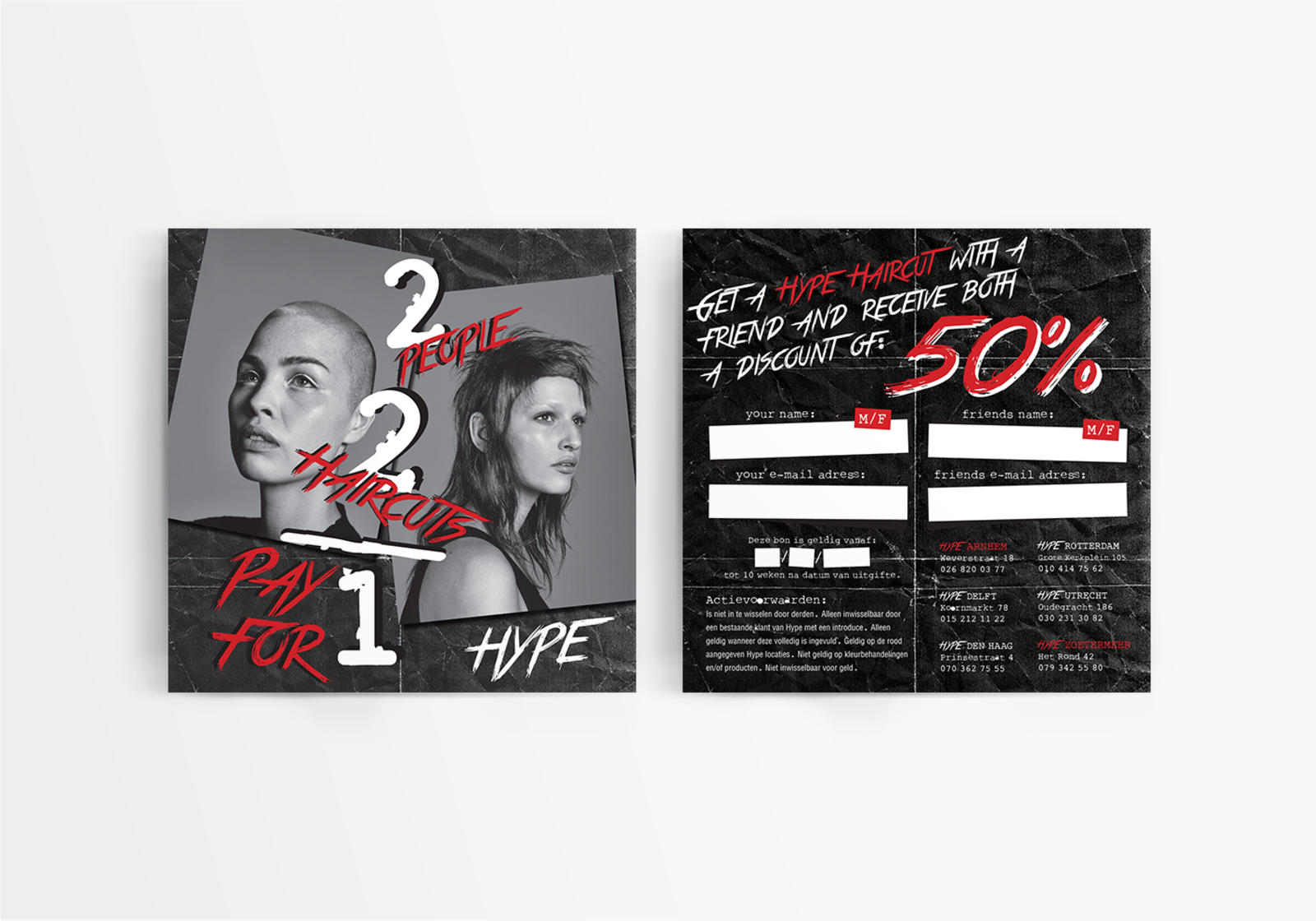 Een selectie van flyers, baliecommunicaties en screen advertisements die ik voor Hype kappers heb vormgegeven.